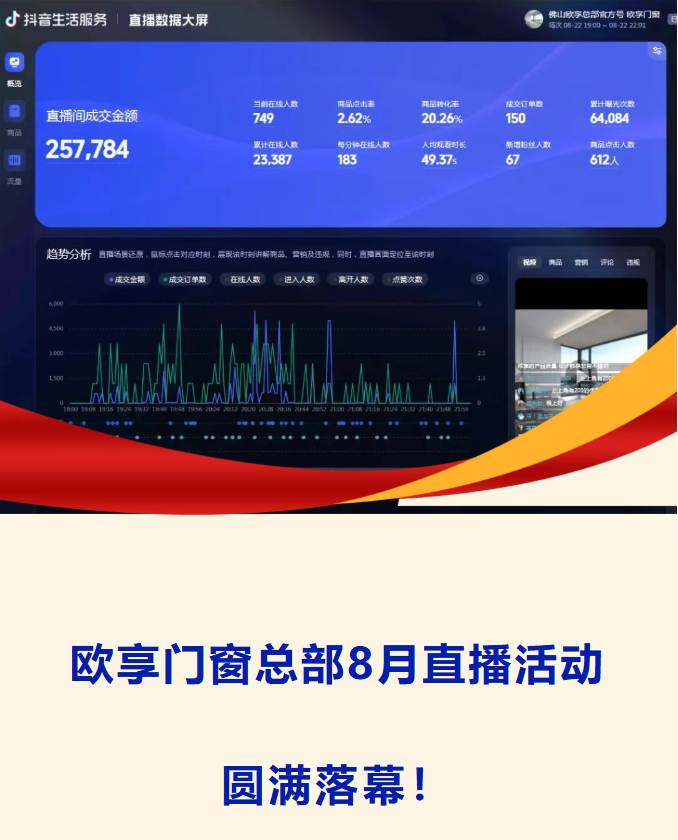 回顾8月的每个周五,欧享门窗总部直播间都人气爆棚。从工厂直供的爆款门窗底价亮相,到限时秒杀的激烈角逐;从互动抽奖的惊喜连连,到主播对产品工艺、空间搭配的专业解读……每一场直播都紧扣“享”字内核——让消费者享受高性价比产品,让经销商享受总部引流的红利。